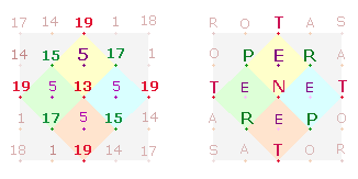 Die ZS des TENET-Kreuzes ist 109, jeder Achse 61, sodaß bei der Addition der beiden Summen zu 231 das N mit dem ZW 13 dreimal verwendet wird. 231 ist die Summe der Zahlen von 1-21, durch die Hinzufügung der entsprechenden FS 165 kommt 396 = 36*11 zustande. 143 ist die ZS von SATOR PERNET. 1813 bezieht sich auf 18 Elemente der drei Tetraktysseiten und 13 Elemente der drei Hexagonachsen:
