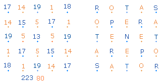 In beiden Wortgruppen treten bestimmte Buchstaben (blau gekennzeichnet) vermehrt hervor. Zunächst sei auf die oberen 5 Wörter eingegangen. Die fast gleichlautenden Wörter DUCENT und DICENT sind in EXCUDENT und DESCRIBENT enthalten. Die Zahlenwerte (ZW) 20 und 9 von U und I, zusammengesetzt aus 4*5 und 5+4, kennzeichnen den Rahmen des SATOR-Quadrats: Jede der 4 Seiten besteht aus 5 Punkten, und eine Seite aus 5 Punkten + 4 Linien.