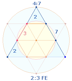 Neben den vertrauten Kreisflächeneinheiten (FE) 1:2 und 1:3 ist auch das seltenere Verhältnis 2:3 zu beachten. Es wird durch 4:7 Elemente einer von 3 Tetraktysseite dargestellt: