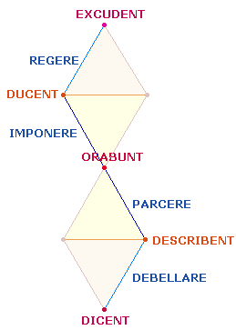 Von besonderer Bedeutung in einem Text sind die Verben. Die 4+3 Vergilverse enthalten 5 finite futurische Verben + 4 Infinitive mit gematrischer Ausrichtung auf die genannten Kreisflächeneinheiten. Denn die 5 Verben sind den 5 Elementen der hexagonalen Kreisachse zuzuordnen, die 4 Verben den 2*2 Erweiterungselementen auf der DR-Zickzacklinie der Doppelraute (DR):