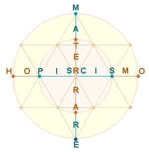 man die Einerzahlen beider ZW, erhält man 3+5 = 8 für MARE und 5+9 = 14 für TERRA. Die entsprechenden Buchstaben sind HO, die ersten beiden Buchstaben von